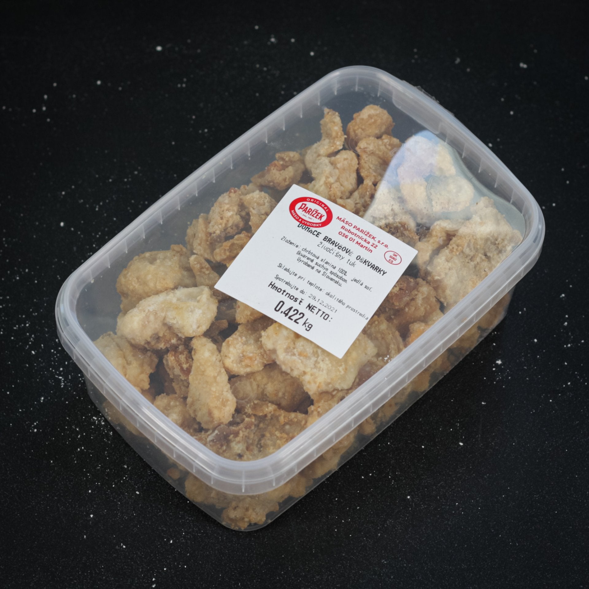 Zloženie: chrbtová slanina 100%, soľ. Bez prídavných látok. Škvarené suchým spôsobom. Môže obsahovať zbytky br. koží.