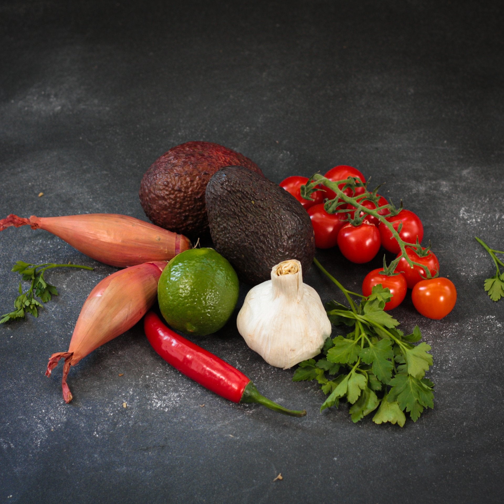 V balíčku na prípravu guacamole nájdete: 2 ks avokádo zrelé zelené/ čierne, koriander, strúčiky cesnaku, šalotka, chilli paprička cayene, limetka, cherry paradajky.
