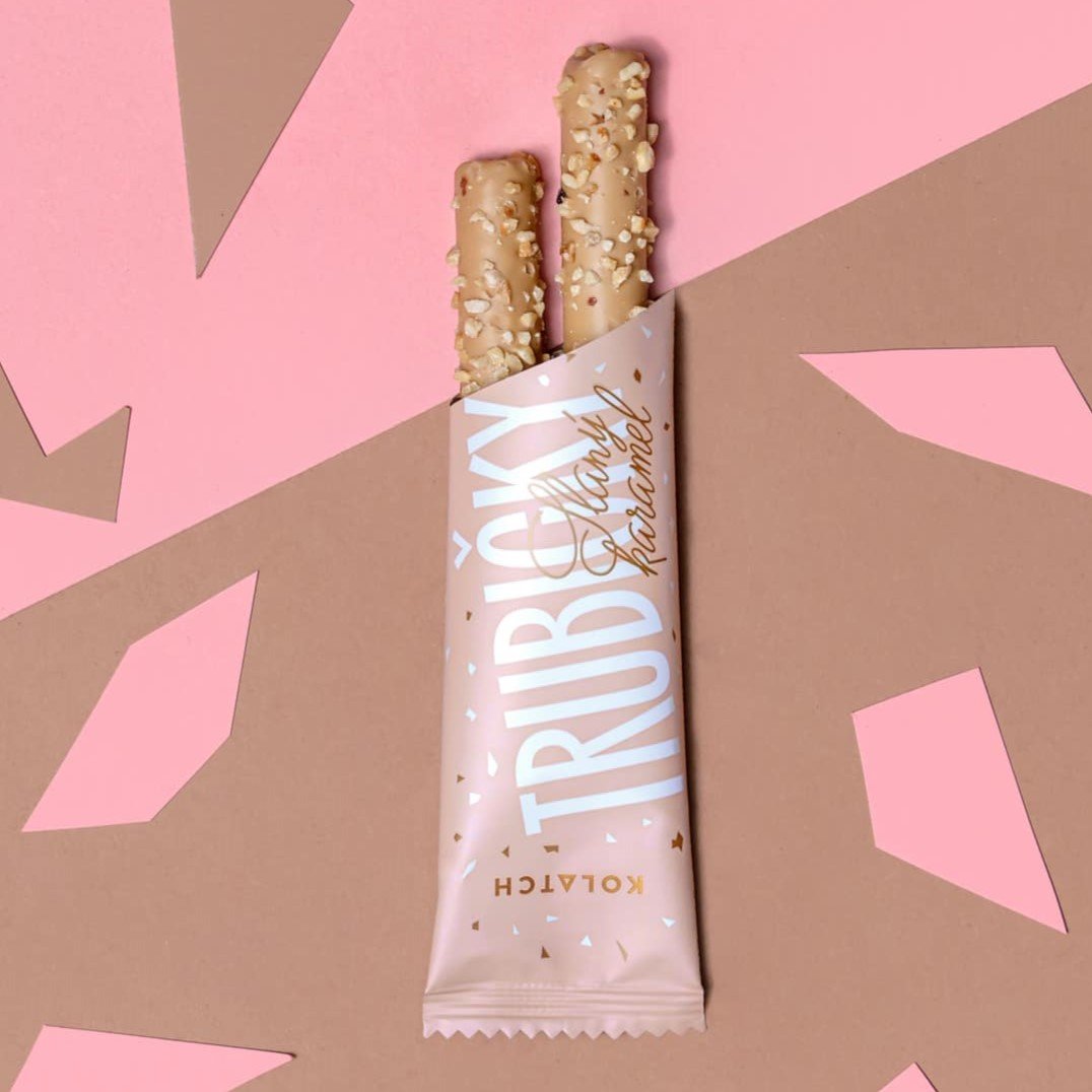 Trubičky s náplňou slaný karamel (62%) v bielej čokoláde s karamelom a lieskovcami 35g.